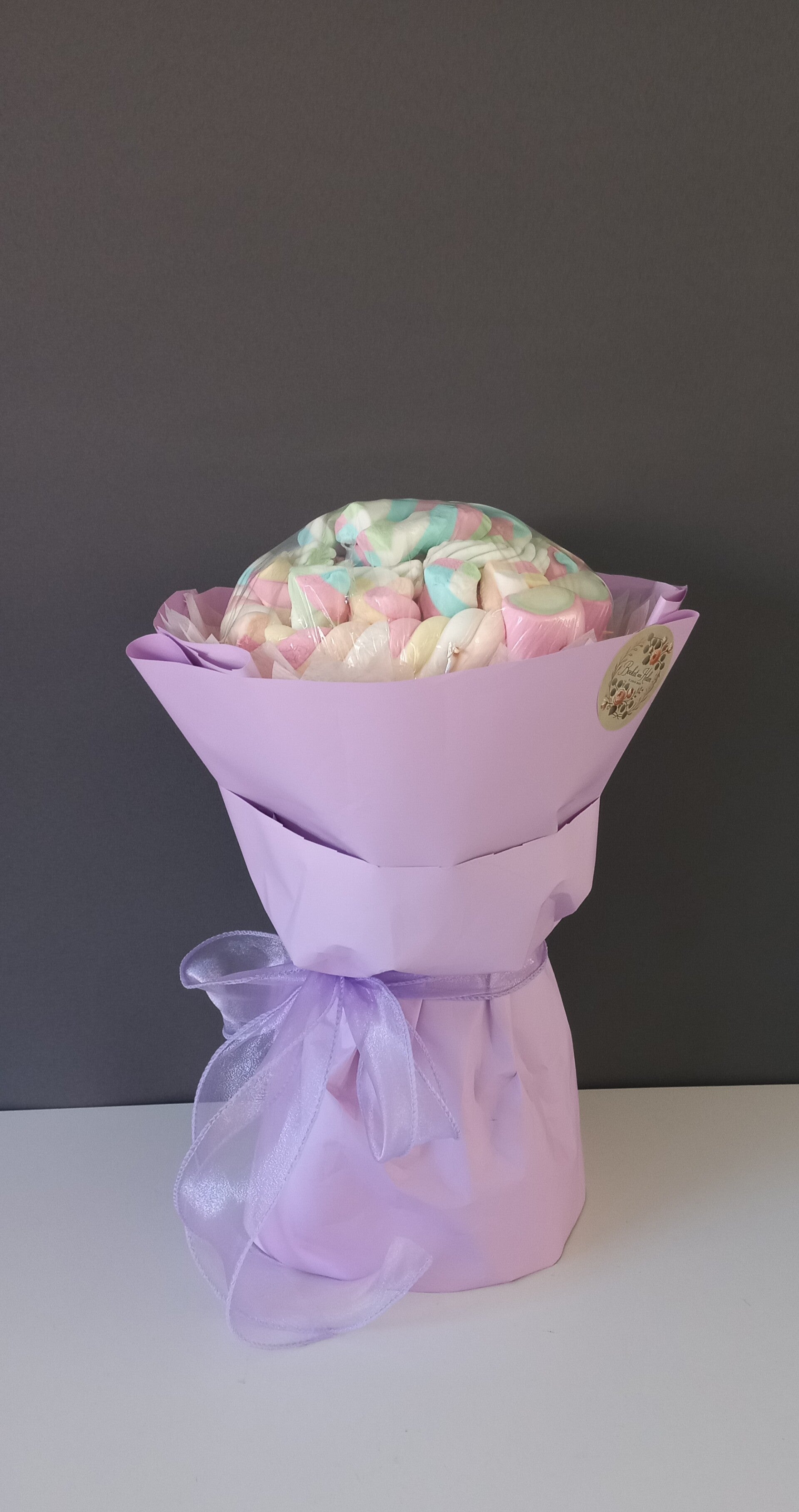 Het boeket Marshmallow Cloud is gevuld met marshmallows van verschillende vormen en kleuren