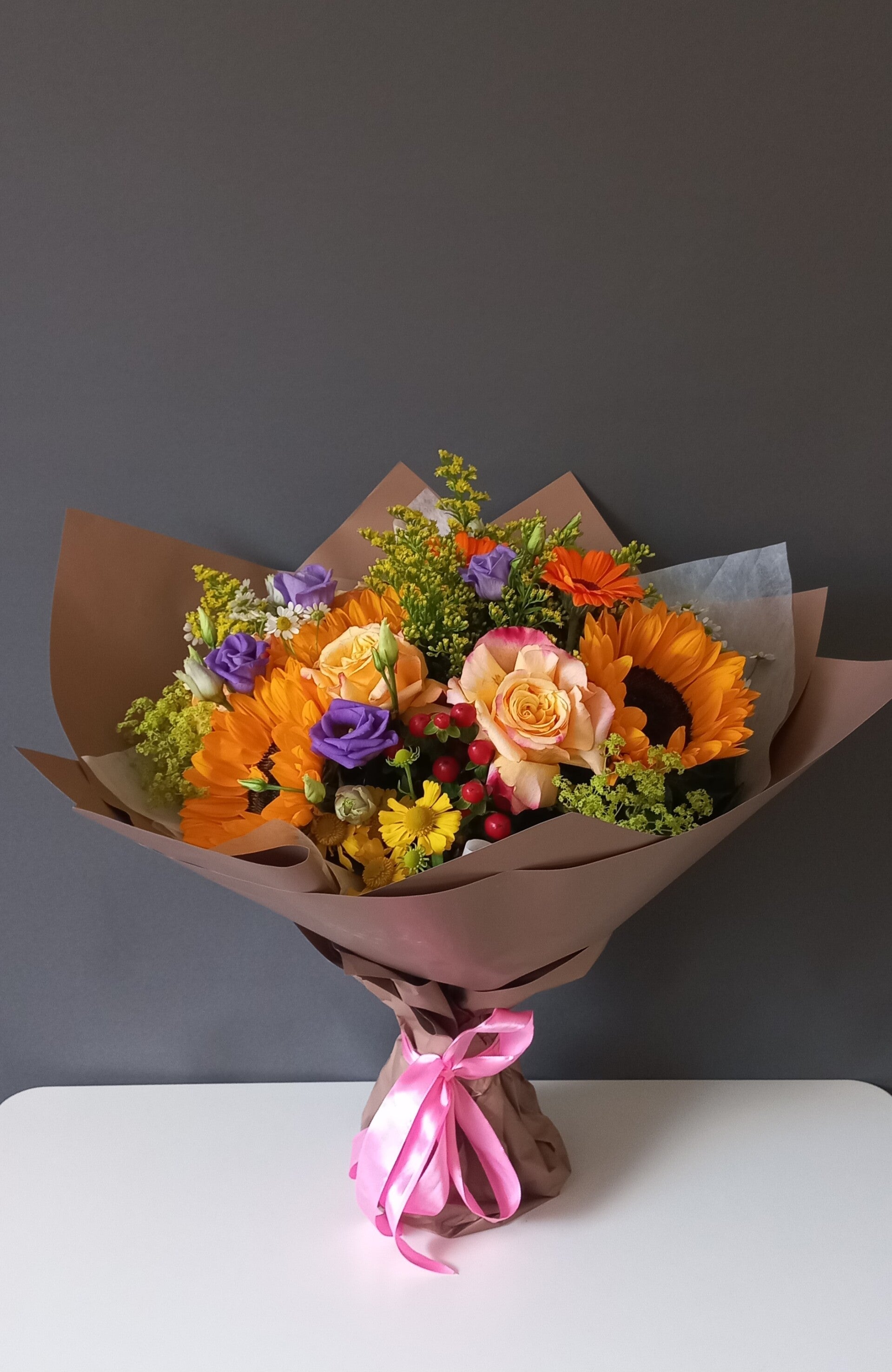 Een heldere, kleurrijke boeket voor een goed humeur! Samenstelling van het boeket: lelie, gerbera, statice, struikChrysant, amarant, groen.