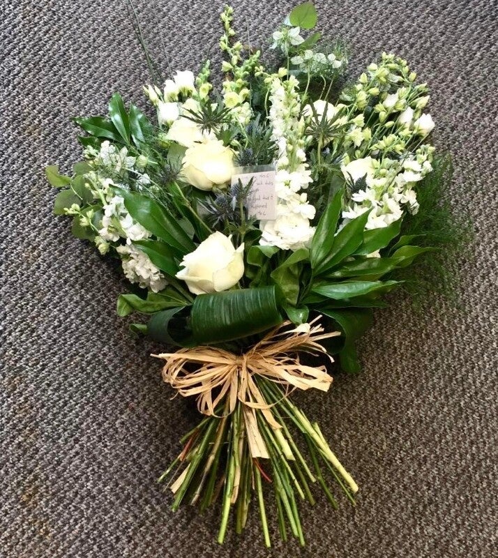 Klasseboeket in wit voor rouw. Het boeket bevat witte delphinium, lisianthus, alstroemeria, eryngium, witte rozen, physostegia en verschillende soorten groen.