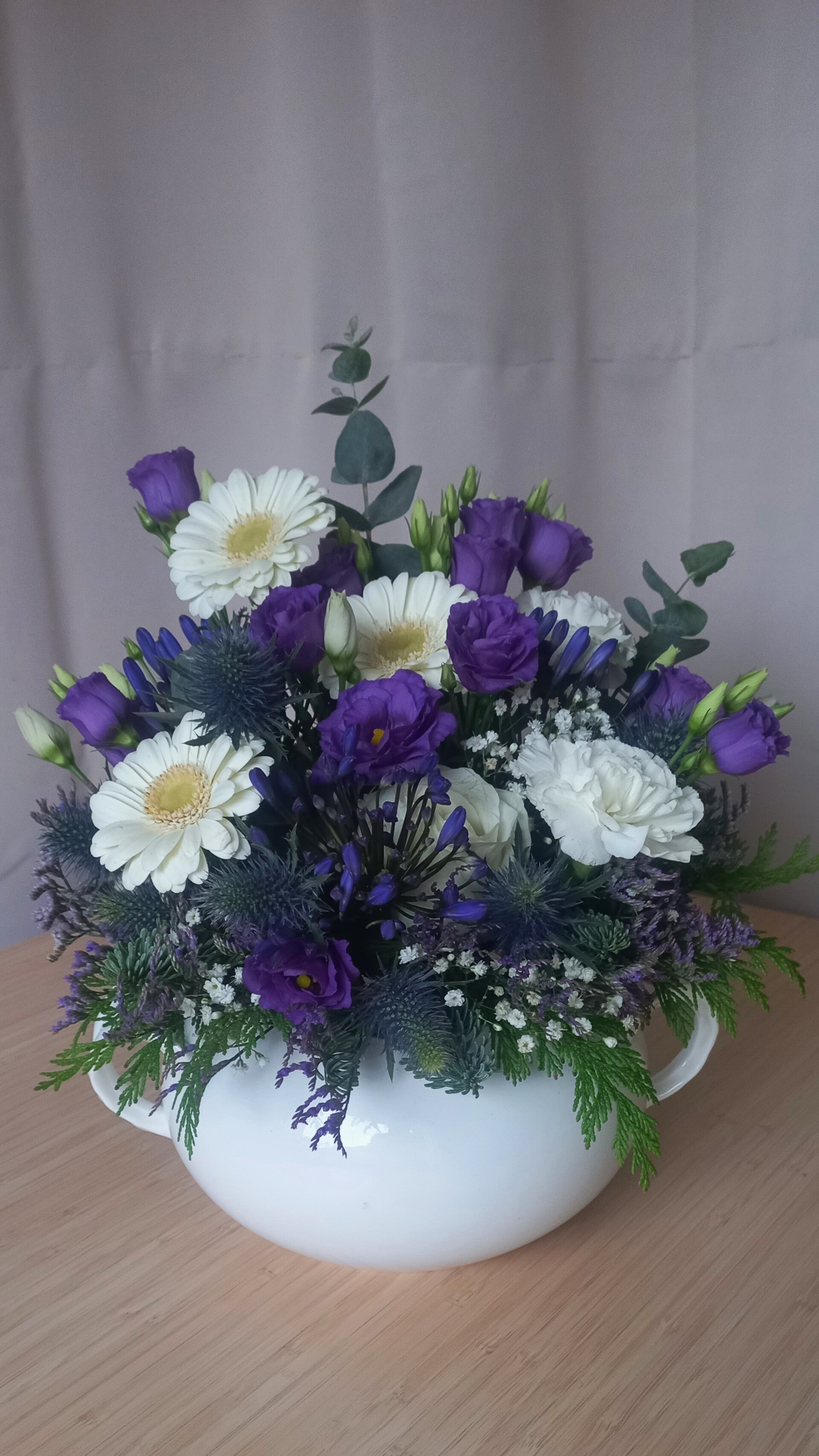 Het bloemstuk bestaat uit Anjer, wit en blu Eustoma, gerbera, Agapantus, Eucaliptus, met pot.
