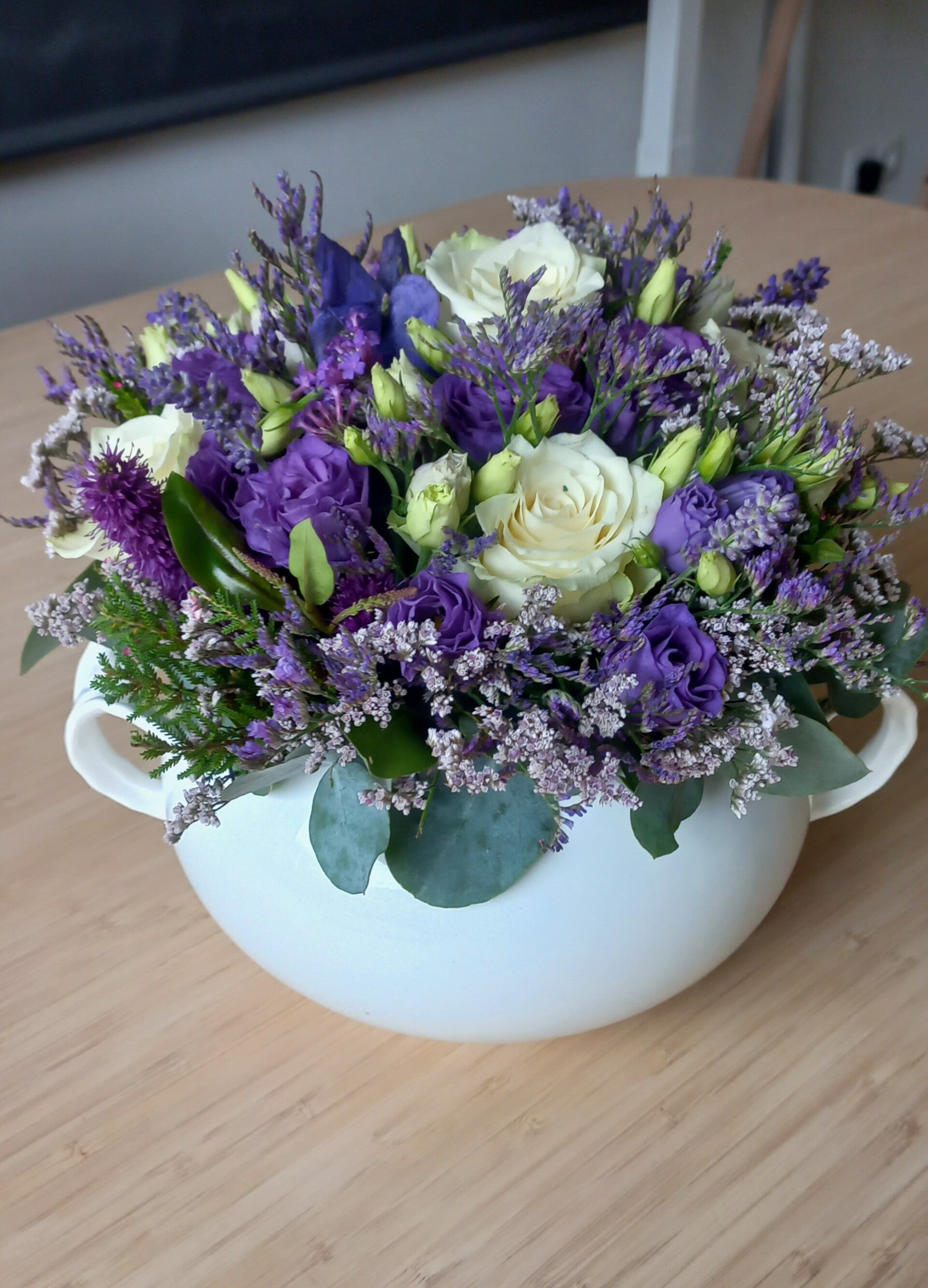 kleuren, Aconitum,Limonium, Witte rozen, Paars Eustoma, Salvia.