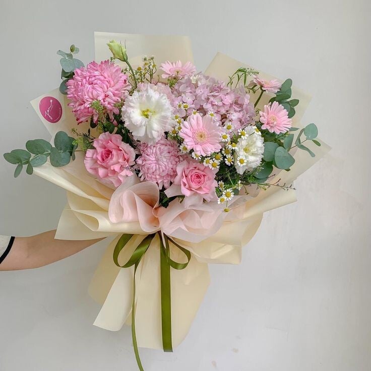 Een zachte bos in roze tinten bestaat uit roze hortensia, lisianthus, roos, gerbera, chrysant en tansy. Groen, eucalyptus.