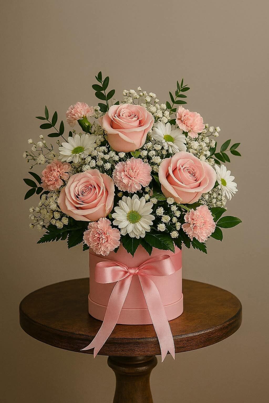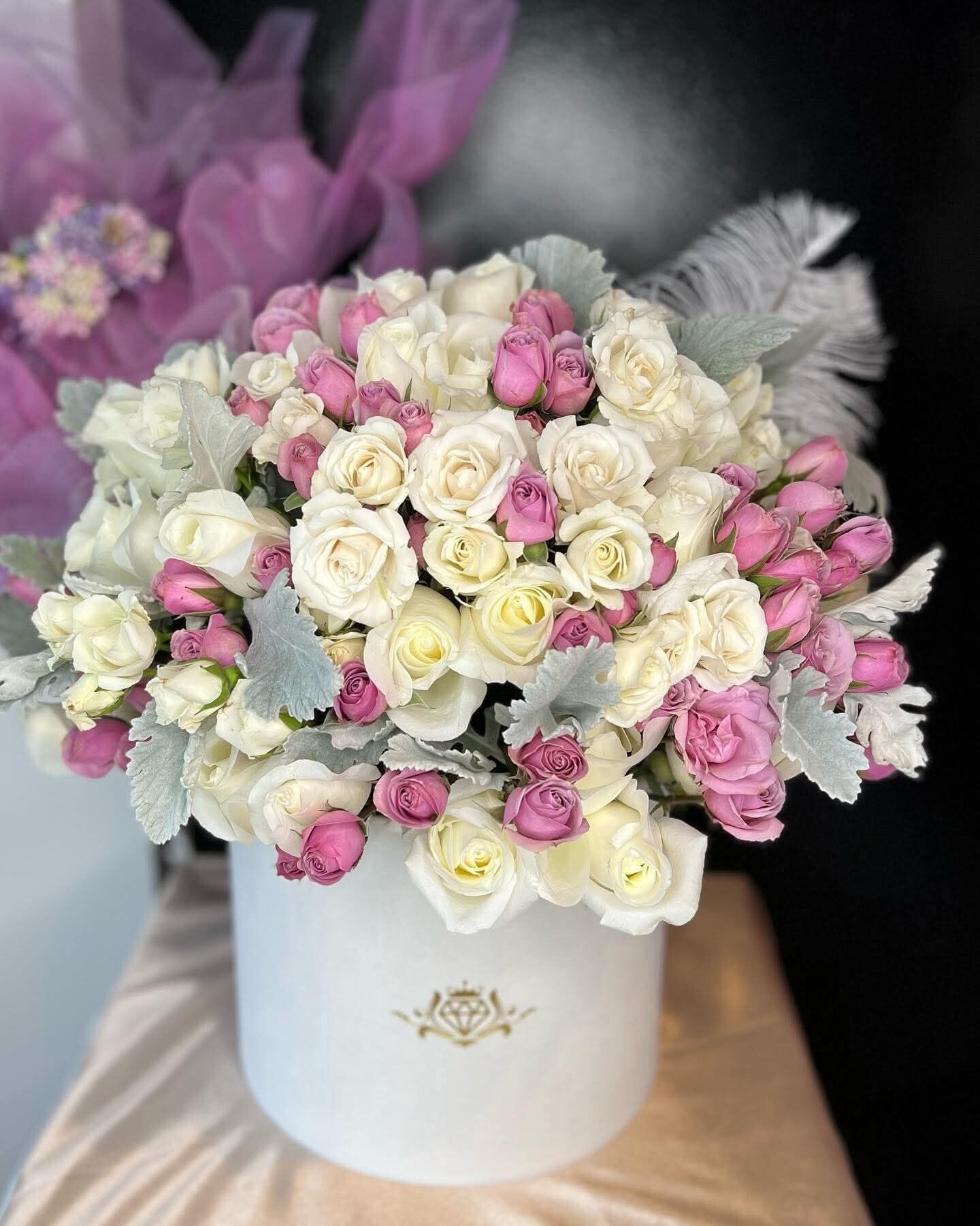 Bloemstuk in een mand, bloempot of doos. De bloemen kunnen worden samengesteld naar uw wens en voorkeur.