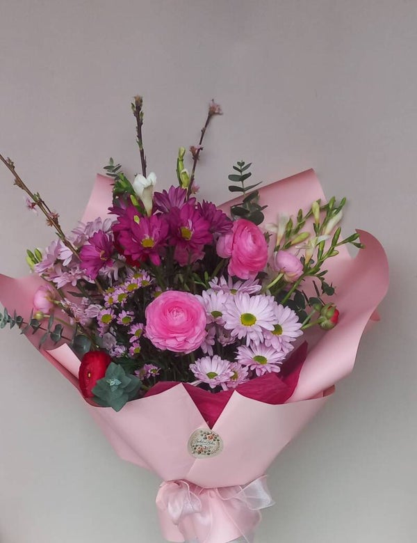 Boeketcompositie Astoria: Struikchrysant, ranunculus, freesia, sakuratakken en eucalyptus.